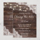 Las cosas cambian. Envíe a sus invitados una hermosa invitación de cambio de fecha de boda debido a esta invitación de madera azul y encaje con luces de cadenas. Ideal para bodas campestres y al aire libre.
