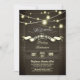 INVITACIONES RÚSTICAS DE DUCHA BRIDAL EN EL PAÍS, con fondo de arpillera, luces de cuerda brillantes y elegante tipografía occidental vintage con un cartel.