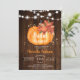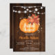 Luces rústicas de moda dorada de floral caen en una invitación a la fiesta de la ducha nupcial con luces de cuerda blancas en madera marrón rústica y una calabaza de color naranja pintada a mano con caparazón rojo, hojas marrones, flores y ramas de trigo ramo ramo ramo ramo ramo con una tipografía moderna y elegante con confeti purpurina dorado.