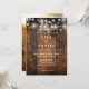 Esta invitación de boda de madera de granero rústico occidental con herraduras y luces de cuerda en un fondo de madera de granero se puede personalizar con su información en tipografía elegante y su foto especial en el reverso. Diseñado por Thisisnotme