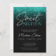 Esta moderna y dulce invitación de 16 comensales cuenta con luces brillantes verde azuladas de agua y un moderno tipo de letra de caligrafía sobre fondo negro. Un diseño perfecto para una glamorosa celebración dulce de 16 años. Edite esta dulce plantilla de invitación de 16 usted mismo usando las herramientas de edición en línea.