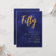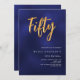 Una invitación moderna y elegante para una fiesta de cumpleaños número 50 tanto para él como para ella. El color azul es desigual. Fondo azul marino y la palabra Cincuenta escrita con grandes letras falsas de oro. Personalice y agregue un nombre y detalles del fiesta. Texto blanco.