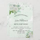 Una invitación moderna, elegante y glamurosa para una fiesta de cumpleaños número 40 (o cualquier edad) de una mujer. Un fondo verde de color agua con un polvo falso purpurina plateado y flores y vegetación blancas. El nombre está escrito con un guión moderno de estilo con letras de color negro. Personalice y agregue un nombre, edad y detalles de su fiesta