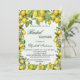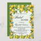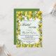 Un fondo de color verde acuático. Decorado con limones amarillos y follaje verde. Personalice y agregue un nombre y detalles del fiesta. El nombre se escribe con un guión de estilo con letras a mano. Parte posterior: fondo verde
