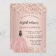 Una invitación moderna, elegante y glamurosa para 2 Quinceañeras, fiestas de 15 años. Un fondo dorado rosa con chispas falsas, un chica con un vestido de bata de bolas. Los nombres se escriben con una escritura de estilo con letras a mano moderna. Personalice y agregue los detalles de su fiesta. Un nombre en cada lado.