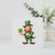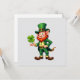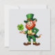malicieux, vêtu d'un vêtement vert vif. Le lutin porte un grand chapeau haut de forme orné d'une petite boucle dorée. Dans sa main, il tient un grand trèfle à quatre feuilles, symbole de chance. Le dessin présente des lignes claires et nettes et utilise des couleurs vives et contrastées telles que le vert vif, l'or et des touches de noir pour mettre en valeur les traits et les vêtements du personnage.