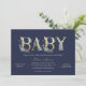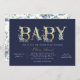 Ya sea que no puedas reunirte para un fiesta debido a las pautas de distanciamiento social del coronavirus, o que la familia y amigos de larga distancia están demasiado lejos, esta hermosa invitación de Baby Shower por correo permitirá a los seres queridos celebrar tu recién nacido desde cualquier lugar. Este elegante diseño presenta una imitación de la tipografía de Relieve metalizado dorado con delicados florales de acuarela sobre un fondo azul marino. Utilice las herramientas de diseño para añadir los detalles de su ducha o personalizar virtual para adaptarse a su evento.