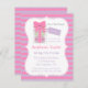 Esta elegante, moda y elegante invitación a una fiesta de té con ducha de bebé es perfecta para invitar a la madre a ser, a un fiesta de té acogedor y relajante por la tarde con un grupo de amigos cercanos. La invitación rosa y púrpura tiene 3 deliciosos macarones de púrpura, menta y rosa envasados en un bonito envase con cinta rosa y una etiqueta de regalo que dice "baby shower". Patrón de rayas rosadas y violetas para fondo. La cocina francesa y la paleta de colores añaden elegancia. Personalice fácilmente con detalles fiestas.