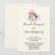 Invitación de boda con una imagen encantadora. 3 macarons coloridos, rosa, verde y azul con un ramo floral de rosa elegante y un toque de acuarela rosa detrás. ¡Delicioso y elegante también!