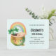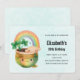 Invitación de cumpleaños con una adorable ilustración que presenta una maceta sonriente verde y dorada con un arcoíris lindo, una nube feliz y algunos tréboles verdes.