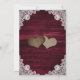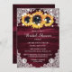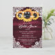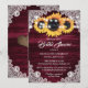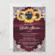 Hermosas invitaciones rústicas burdeos a la ducha de novias con fondo de madera y encaje adornadas con girasoles y luces de cuerdas. Elementos coincidentes disponibles.