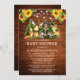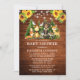 Invitación Baby Shower de Watercolor Woodland Animals. Entre los animales para bebés se encuentran: Oso, ciervo, alce, mapache, conejo conejo, zorro y búho con un fondo de pinos. Pino verde forestal y madera rústica de campo. Sunflowers y String Lights.