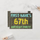 Este divertido diseño de invitación para fiestas de cumpleaños incluye un mensaje como "¡FIESTA DEL CUMPLEAÑOS 67 DE NOMBRE PRIMERO!", donde el nombre puede ser personalizado, en la parte delantera. El fondo está decorado con un estilo rústico, marrón y falso de aspecto de grano de madera. El texto del mensaje de personalizable en la parte delantera presenta colores como azul, amarillo y verde, y tiene un aspecto inspirado en el de las letras pintadas y estampadas. En la parte posterior se muestra un mensaje personalizado que podría incluir detalles importantes sobre la fiesta de cumpleaños, como cuándo y dónde se celebra, junto con cualquier otra información que sea relevante. Las invitaciones de cumpleaños como esta pueden ser una manera divertida de invitar a familiares y amigos a una fiesta de cumpleaños que se lleva a cabo para alguien que está celebrando su sexagésimo séptimo cumpleaños. [~Z0000291]