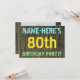 Este divertido diseño de invitaciones para fiestas de cumpleaños incluye un mensaje como "¡NOMBRE DE LA FIESTA DE CUMPLEAÑOS DE AQUÍ!", donde el nombre puede ser personalizado, en la parte delantera. El fondo está decorado con un estilo rústico, marrón y falso de aspecto de grano de madera. El texto del mensaje de personalizable en la parte delantera presenta colores como azul, amarillo y verde, y tiene un aspecto inspirado en el de las letras pintadas y estampadas. En la parte posterior se muestra un mensaje personalizado que podría incluir detalles importantes sobre la fiesta de cumpleaños, como cuándo y dónde se celebra, junto con cualquier otra información que sea relevante. Las invitaciones a fiestas de cumpleaños como esta pueden ser una manera divertida de invitar a familiares y amigos a una fiesta de cumpleaños que se lleva a cabo para alguien que está celebrando su ochenta cumpleaños. [~Z0000291]