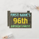 Este divertido diseño de invitación para fiestas de cumpleaños incluye un mensaje como "¡FIESTA DEL CUMPLEAÑOS 96 DE NOMBRE PRIMERO!", donde el nombre puede ser personalizado, en la parte delantera. El fondo está decorado con un estilo rústico, marrón y falso de aspecto de grano de madera. El texto del mensaje de personalizable en la parte delantera presenta colores como azul, amarillo y verde, y tiene un aspecto inspirado en el de las letras pintadas y estampadas. En la parte posterior se muestra un mensaje personalizado que podría incluir detalles relevantes sobre la fiesta de cumpleaños, como cuándo y dónde se celebra, junto con cualquier otra información que sea importante. Las invitaciones a fiestas de cumpleaños como esta pueden ser una manera divertida de invitar a familiares y amigos a una fiesta de cumpleaños que se lleva a cabo para alguien que está celebrando su cumpleaños número noventa. [~Z0000291]