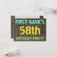 Este divertido diseño de invitaciones para fiestas de cumpleaños incluye un mensaje como "¡FIESTA DEL CUMPLEAÑOS 58 DE NOMBRE PRIMERO!", donde el nombre puede ser personalizado, en la parte delantera. El fondo está decorado con un estilo rústico, marrón y falso de aspecto de grano de madera. El texto del mensaje de personalizable en la parte delantera presenta colores como azul, amarillo y verde, y tiene un aspecto inspirado en el de las letras pintadas y estampadas. En la parte posterior aparece un mensaje personalizado que podría incluir detalles importantes sobre la fiesta de cumpleaños, como cuándo y dónde se celebra, junto con cualquier otra información que sea relevante. Las invitaciones a la fiesta de cumpleaños como esta pueden ser una manera divertida de invitar a familiares y amigos a una fiesta de cumpleaños que se lleva a cabo para alguien que está celebrando su cincuenta y ocho años. [~Z0000291]