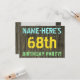 Este divertido diseño de invitación para fiestas de cumpleaños incluye un mensaje como "¡NOMBRE DE LA FIESTA DE CUMPLEAÑOS 68!", donde el nombre puede ser personalizado, en el frente. El fondo es rústico, marrón, de apariencia de grano de madera falsa. El texto del mensaje de personalizable en la parte delantera presenta colores como azul, amarillo y verde, y tiene un aspecto inspirado en el de las letras pintadas y estampadas. En la parte posterior se presenta un mensaje personalizado que podría incluir detalles relevantes sobre la fiesta de cumpleaños, como cuándo y dónde se celebra, junto con cualquier otra información importante. Las invitaciones para fiestas de cumpleaños como esta pueden ser una manera divertida de invitar a familiares y amigos a una fiesta de cumpleaños que se lleva a cabo para alguien que está celebrando su sexagésimo octavo cumpleaños. [~Z0000299]