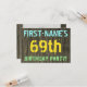 Este divertido diseño de invitación para fiestas de cumpleaños incluye un mensaje como "¡FIESTA DEL CUMPLEAÑOS 69 DE NOMBRE PRIMERO!", donde el nombre puede ser personalizado, en la parte delantera. El fondo está decorado con un estilo rústico, marrón y falso de aspecto de grano de madera. El texto del mensaje de personalizable en la parte delantera presenta colores como azul, amarillo y verde, y tiene un aspecto inspirado en el de las letras pintadas y estampadas. En la parte posterior aparece un mensaje personalizado que podría incluir detalles relevantes sobre la fiesta de cumpleaños, como cuándo y dónde se celebra, junto con cualquier otra información que sea importante. Las invitaciones a fiestas de cumpleaños como esta pueden ser una manera divertida de invitar a familiares y amigos a una fiesta de cumpleaños que se lleva a cabo para alguien que está celebrando su sexagésimo noveno cumpleaños. [~Z0000291]
