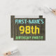 Este divertido diseño de invitación para fiestas de cumpleaños incluye un mensaje como "¡FIESTA DEL CUMPLEAÑOS 98 DE NOMBRE PRIMERO!", donde el nombre puede ser personalizado, en la parte delantera. El fondo está decorado con un estilo rústico, marrón y falso de aspecto de grano de madera. El texto del mensaje de personalizable en la parte delantera presenta colores como azul, amarillo y verde, y tiene un aspecto inspirado en el de las letras pintadas y estampadas. En la parte posterior aparece un mensaje personalizado que podría incluir detalles importantes sobre la fiesta de cumpleaños, como cuándo y dónde se celebra, junto con cualquier otra información que sea relevante. Las invitaciones a fiestas de cumpleaños como esta pueden ser una manera divertida de invitar a familiares y amigos a una fiesta de cumpleaños que se lleva a cabo para alguien que está celebrando su cumpleaños noventa y ocho. [~Z0000291]