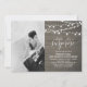Celebre su día especial con esta invitación personalizada de aniversario de boda con foto. Este diseño presenta hermosa tipografía "shhh...es una sorpresa" y luces de cuerda sobre un fondo de madera rústica. Puede personalizar el texto para cualquier año. Reemplace la foto de muestra con su propia foto. Suministros para fiestas a juego disponibles en mi tienda BaraBomDesign.
