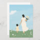 Un ilustracion sereno de una madre y un niño caminando codo a codo a través de un prado vibrante lleno de flores blancas. La madre, vestida con un vestido blanco, sostiene un ramo de margaritas que simbolizan el amor y la pureza. El cielo azul claro, con sus nubes suaves, crea un ambiente tranquilo y alegre.