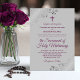 Esta hermosa invitación a la boda es perfecta para una ceremonia católica moderna. Cuenta con un bonito diseño con magenta elegante, letras de escritura violeta de cassis o color berry y rizos gris plateado ornamentados y giros en las esquinas sobre un fondo gris. Incluye una cruz o crucifijo, y un texto que invita a sus invitados a asistir a una misa nupcial uniendo a la pareja en el sacramento del santo matrimonio. Esta invitación es la combinación perfecta de tradición formal y estilo moderno, lo que hace que sea una manera maravillosa de invitar a tus amigos y familiares a compartir tu alegría en tu día especial.
