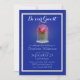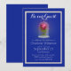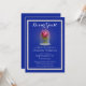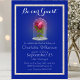 Esta invitación de fiesta temática de La Bella y la Bestia presenta un hermoso fondo azul real con un marco blanco con brillo. Una encantadora y mágica rosa roja está colocada en el centro, encerrada en vidrio brillante. La frase "Sea nuestro invitado" está impresa en una fuente caprichosa de cuento de hadas encima de la rosa.