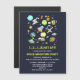 Invitación a la fiesta de cumpleaños en papel magnético. Diseñado con un diseño adorable y colorido con todo tipo de elementos temáticos en el espacio ultraterrestre. Las imágenes incluyen astronautas flotando en sus espacios blancos. Estrellas y planetas y pequeños buques de cohetes, naves espaciales y satélites frescos. Diseño divertido y loco.