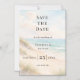 A watercolored sandy beach, sand dunes, ocean waves background. Personalize and add a date and your names. The text: Save the Date is written with a large trendy hand lettered style script.