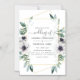 Flores de eucalipto y adormidera en tonos pastel invitan a la boda con marco geométrico dorado y tipografía elegante de escritura a mano.