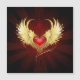 Corazón rojo brillante de un ángel con alas doradas brillando en el fondo rojo oscuro y radiante decorado con un patrón.
