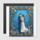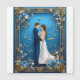 Una representación romántica de una pareja boda posando con delicadeza, rodeada de intrincadas decoraciones florales azules y doradas, que captan un ambiente de elegancia y celebración.