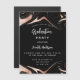 Una invitación moderna para una fiesta de graduación. Un fondo negro decorado con remolinos de oro rosas. Personalice y agregue un nombre y detalles del fiesta. El texto Graduación y el nombre están escritos con escritura de estilo con letras a mano moderna. Texto de color blanco.
