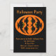 Esta impresionante invitación magnética de fiesta incluye un oval naranja con seis cuervos. Cada cuervo tiene ojos amarillos con pupilas negras y alas estiradas. Los cuervos están volando unos hacia otros formando una forma oval. El fondo es negro.