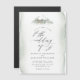 Si tiene previsto celebrar a su boda al aire libre o simplemente amar la vegetación y las montañas, esta boda invitación magnética será perfecta para usted. Con hojas de color verde agua alrededor de una fuente caligráfica de moda, un ilustracion de cabaña de madera y montaña en la parte superior con árboles. Los detalles de su boda se muestran en una tipografía elegante de serif situada sobre un fondo de color de agua descolorido. Perfecto para bodas de temática rústica o rural.