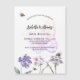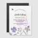 Un fondo blanco en la parte delantera. Decorado con abejas y flores silvestres pintadas en violeta y rosa y con una gran mariposa. Personalice y agregue un nombre y detalles del fiesta.
