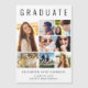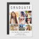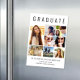 Elegante invitación de graduación de sake magnético para celebrar el graduado que presenta "GRADUATE" en la cima de la tipografía grande, un collage de siete fotos y su nombre, curso de clase y escuela en tipografía moderna.