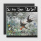 En este imán magnético se encuentra la tarjeta de Invitación Save the Date Boda, una magnífica pintura artística de estilo vintage de las aves Swopoping/Swift, flor de flores silvestres, cachorros, margaritas, flores de flores y mariposas, con encaje Reina Annes por todas partes, con franjas. La imagen es de dominio público debido a derechos de autor vencidos.