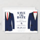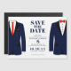 Que todos sepan que ustedes dos se han establecido en una fecha para su boda con este moderno salven la tarjeta de fecha con dos trajes de la marina. Personalice agregando sus nombres, fecha y ubicación de boda.
