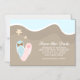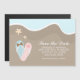 Bodas salvan las invitaciones de dátiles o invitaciones que incluyen un hermoso ilustracion vectorial de un par de sandalias de felpa rosas y azules en una playa de arena junto al océano con un par de estrellas de mar. Perfecto para su playa, destino tropical o boda de verano.