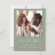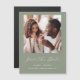Esta sencilla y minimalista tarjeta magnética Save the Date incluye una foto cuadrada encima de las palabras "Save the Date" en un elegante guión de escritura a mano en blanco, seguido por los nombres de la pareja, la fecha boda y la ciudad en letra sans serif en un fondo verde sabio.