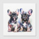 Un caprichoso ilustracion acuático compuesto por dos adorables cachorros de Bulldog franceses uno al lado del otro. Los cachorros tienen distintos abrigos romanos y negros con ojos expresivos y orejas sobredimensionadas. Sus expresiones lúdicas transmiten curiosidad y encanto, enmarcadas en un fondo suave y abstracto que realza sus características. El ambiente general es animado y acogedor, perfecto para mostrar la amabilidad de estos perros queridos.