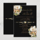 Hermosas flores blancas de Magnolia y anillos bodas dorados sobre un fondo negro y texto dorado. Un hermoso divisor de diamantes separa la palabra "Boda" del resto del texto de la invitación