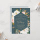Esta elegante tarjeta magnolia verde azulada es perfecta para un boda moderno y elegante. El diseño floral húmedo presenta peonías color agua rosada, impresionantes flores de magnolia blanca con hojas doradas y verdes en un arreglo lujoso sobre un fondo verde azulado.