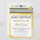 Mamá a Bee Whimsical Bee Baby Shower Invitación. Una ducha de color gris, blanco y amarillo invita a la mamá a ser. Presenta un fondo con motivos de color amarillo y blanco que contiene un banner blanco con texto de estilo poster en fuentes serif y no serif. la parte superior sostiene un borde de tonos grises con puntos de polka amarillos para hacer un elemento de encaje. Las rayas, las flores y las abejas son también un rumor en esta invitación. Muy extravagante y moderno, esta Mamá a Bee Whimsical damask & Bee Baby Shower Invitation está seguro de ser un éxito!