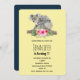 Una invitación de cumpleaños con un adorable diseño de acuarela. Madre de oso y bebé Koala. El bebé está a la espalda de mamá. Parado en una rama de árbol. Un ramo de flores de hibisco debajo de ellas. Fondo amarillo banana.