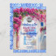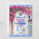 Isla griega de color acuático Mamma Mia, decoración fiesta con flores de buganvillas rosa magenta y azulejos mediterráneos azules.