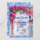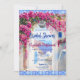 Isla griega de color acuático Mamma Mia, decoración temática con flores de buganvillas rosa magenta y azulejos mediterráneos azules.