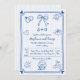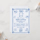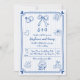 Invitación de boda de estilo francés retro caprichoso con garabatos azules dibujados a mano. Esta invitación de boda es una encantadora mezcla de capricho y encanto retro francés, que presenta deliciosos garabatos azules dibujados a mano que establecen un tono juguetón. Sus invitados quedarán cautivados por las ilustraciones extravagantes, que incluyen corazones dulces, un hermoso anillo y un lazo adorable, todos bellamente dispuestos contra un suave fondo a rayas azules y blancas. La fuente de estilo manuscrita añade un toque personal, mientras que el marco adornado con corazones en las esquinas realza el encanto general, capturando perfectamente la alegría y la emoción de su gran día.