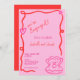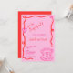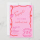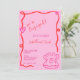 Esta moderna invitación de compromiso ilustrada a mano muestra un borde ondulado de acequia y una concha de ostión garabateando con un anillo de compromiso. El diseño caprichoso y peculiar incluye estilos de letra manuscritos. El rosa y el rojo coloridos le dan un aspecto clásico y moderno a la vez.